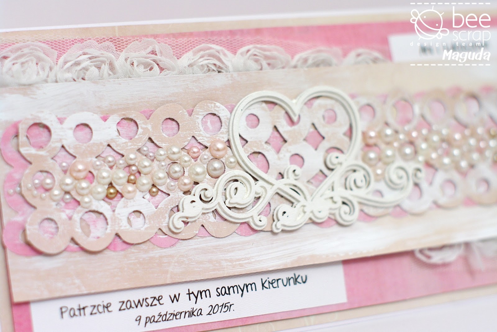 Today, however, the main character is pink ;) I decided to make it tulle and feminine. With a whole lots of pearls. The chipboard is covered with white gesso just as the paper is a few places. At the end I added lots of different pearls just to make the card more glam, more chic and elegant :)